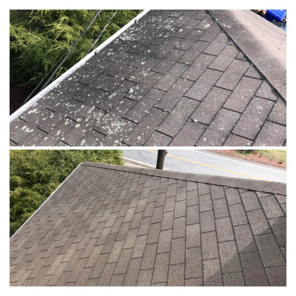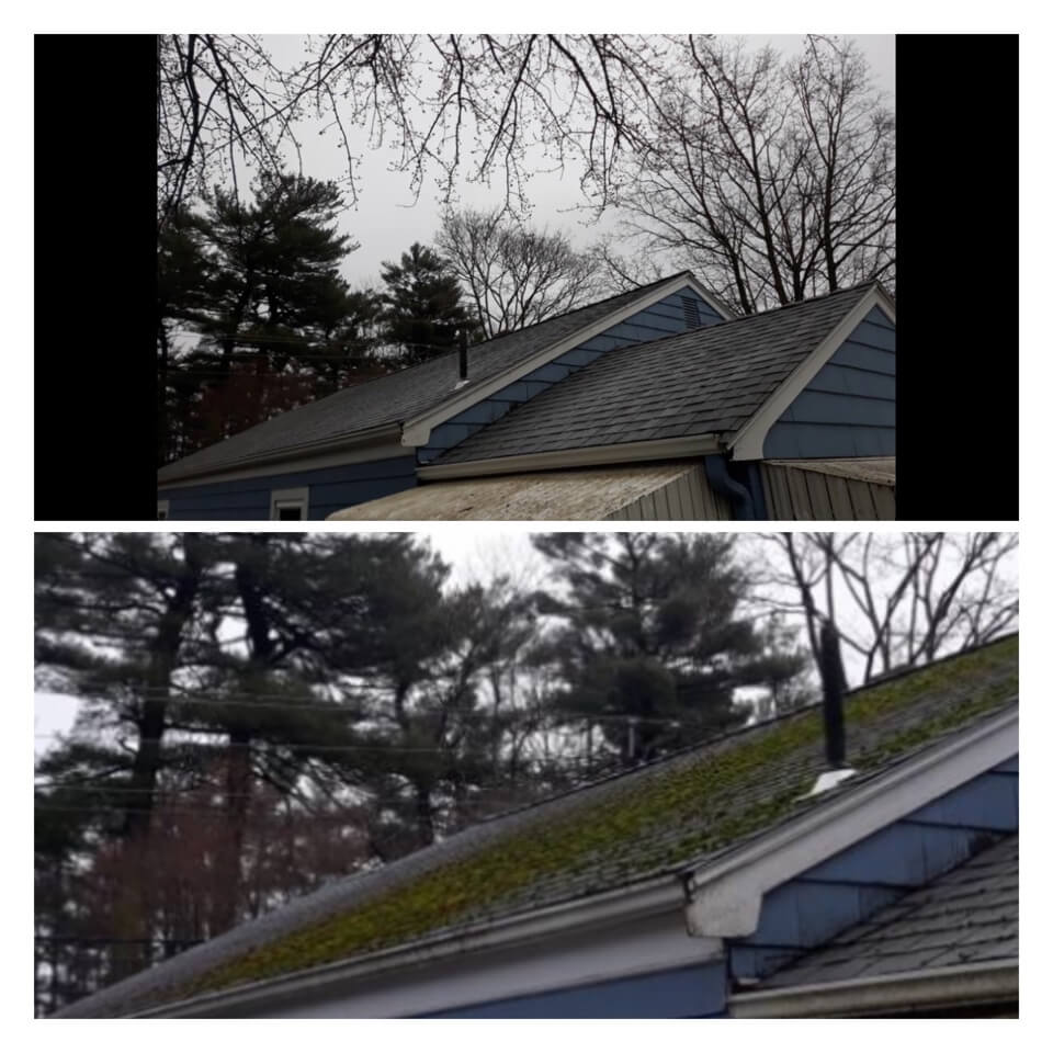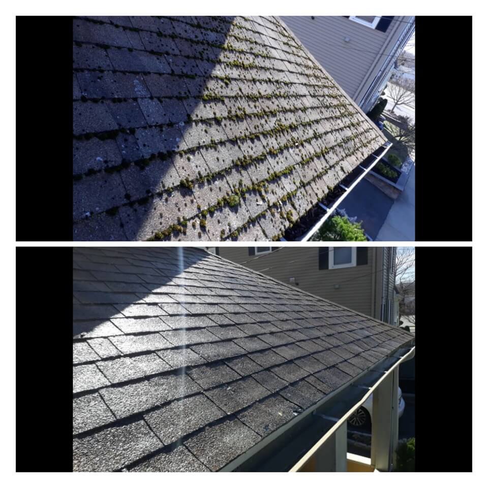 HiCleaners is the most experienced company in Wrentham, MA that deals with roof washing and roof soft washing. All of our employees are trained to recognize precise solution mixing ratios to provide you with the safest and most effective soft washing service. Roofs are a commonly neglected part of a house due to the fact that most people don’t have ladders to access it, so it is very easy to just leave it alone and forget about problems that may start to arise. Just like many home owners, discoloration and small bits of moss on a roof can be overlooked because of the misconception that it is just aesthetic. However, it isn’t just aesthetic, the moss slowly lifts the granules off the shingles which in turn shorten the life of the shingle. The moss also spreads, just like any bacteria if it is left alone for too long, it can quickly become a problem that spirals out of control. Call HiCleaners for a free quote, we only use the most advanced eco-friendly solutions and equipment to make sure the job is done right, for the safety of the employees, your plants, grass, pets, and children.